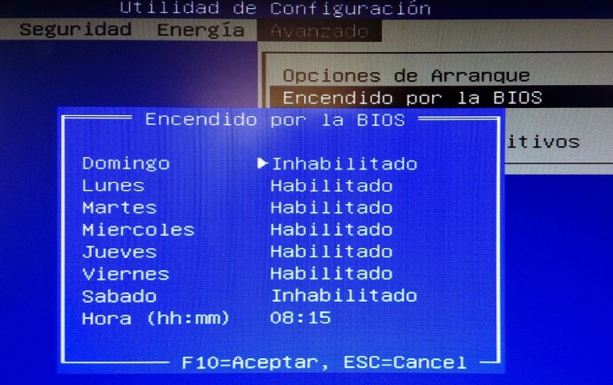 ... i a la pantalla següent podem marcar Habilitado o Inhabilitado els dies de la setmana que volem que arrenquin i l’hora, sortint sempre amb F10 per desar els canvis: