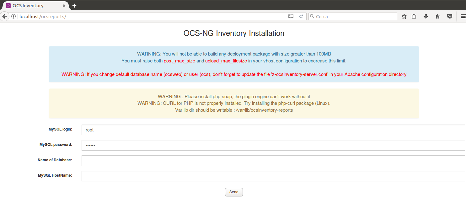 Com veiem a la imatge cal omplir els quatre camps (només apareixen dos complets) amb l’usuari i la contrasenya de la base de dades mysql (que prèviament vàrem guardar), i el nom de la base de dades (ocsweb) y hostname (localhost) on guardarà tota la informació.
